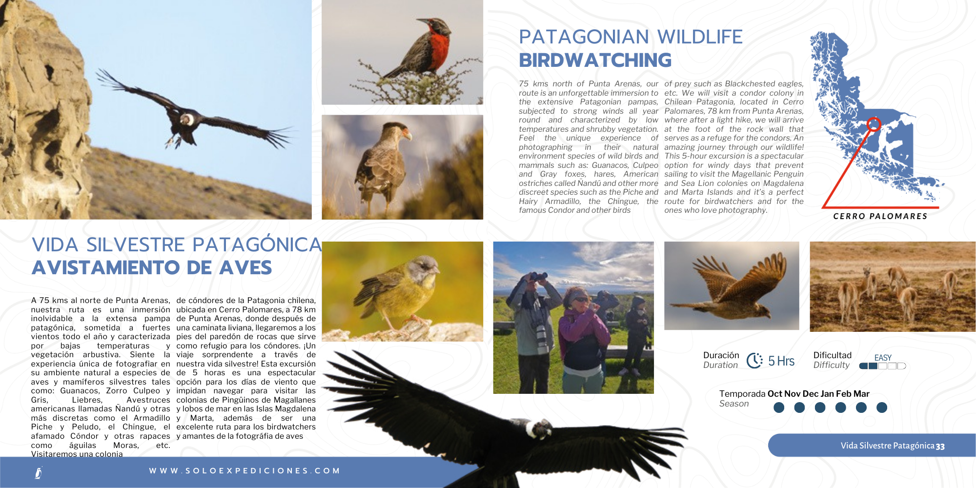 75 kms north of Punta Arenas, our route is an unforgettable immersion to the extensive Patagonian pampas, subjected to strong winds all year round and characterized by low temperatures and shrubby vegetation. Feel the unique experience of photographing in their natural environment species of wild birds and mammals such as: Guanacos, Culpeo and Gray foxes, hares, American ostriches called Ñandú and other more discreet species such as the Piche and Hairy Armadillo, the Chingue, the famous Condor and other birds of prey such as Blackchested eagles, etc. We will visit a condor colony in Chilean Patagonia, located in Cerro Palomares, 78 km from Punta Arenas, where after a light hike, we will arrive at the foot of the rock wall that serves as a refuge for the condors. An amazing journey through our wildlife! This 5-hour excursion is a spectacular option for windy days that prevent sailing to visit the Magellanic Penguin and Sea Lion colonies on Magdalena and Marta Islands and it’s a perfect route for birdwatchers and for the ones who love photography.