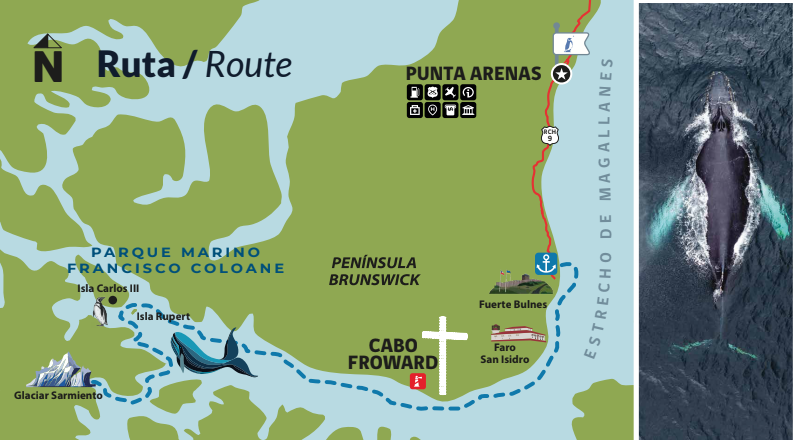 Cape Froward, the southernmost point of the Continental world, Glaciers, Humpback Whales, Sei Whales, Southern Dolphins,Toninas Overas, Magellanic Penguins are part of the natural wonders of this southern area of the Strait of Magellan and Tierra del Fuego.
